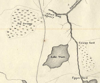 Unfortunately I was not able to find the name of the boy that died - my other alternative is to compare a map of Fort King and present day Ocala and see if the Sutlers store matches the location of the Seven Sisters Inn... that would at least put this boy at the right location. I have found one old map of the Fort courtesy of Exploring Florida As you can see we're not working on much detail on this map... I'll have to come back to this when I find out more info. I'd like to one day look up letters written at the time of this battle and find mention of the deaths and names at the Sutlers store. But for now we at least have a mention of the twelve year old boy. Who knows maybe one day he'll tell us his name. If you have any info on this please write me at sassafrascal@gmail.com